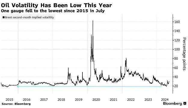 到目前为止,即使原油价格最近暴跌至每桶70美元,2024年的价格波动也比过去几年温和得多。目前,布伦特原油期货正趋向于2004年以来最小的年度价格区间,而今年早些时候,一项衡量市场波动性的指标触及近10年来最低水平。